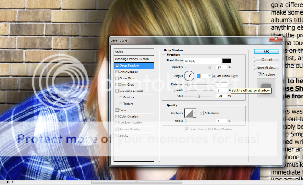 The Drop Shadow tool is one I have become very familiar with! This option allows you to promptly and efficiently add shadows to which ever layer you are working on, at the size or angle how you want it, and this helps create a 3D kind of effect - as though the image is jumping out from the page. I've followed this procedure many a time throughout the production of Dare and when publishing various pictures to Blogger, as I believe shadows can introduce realism to still photos and look much more appealing than a simple, flat image.